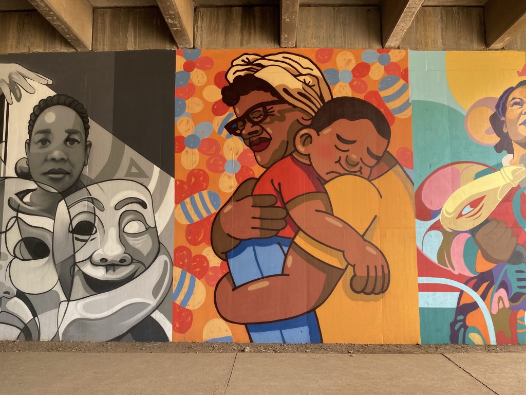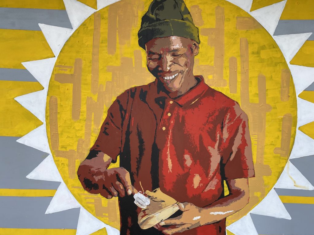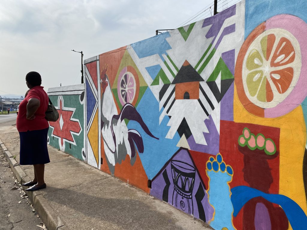3 of 10 “Shine Mpophomeni” panels by HEREI (either side) and MotelSeven (middle)