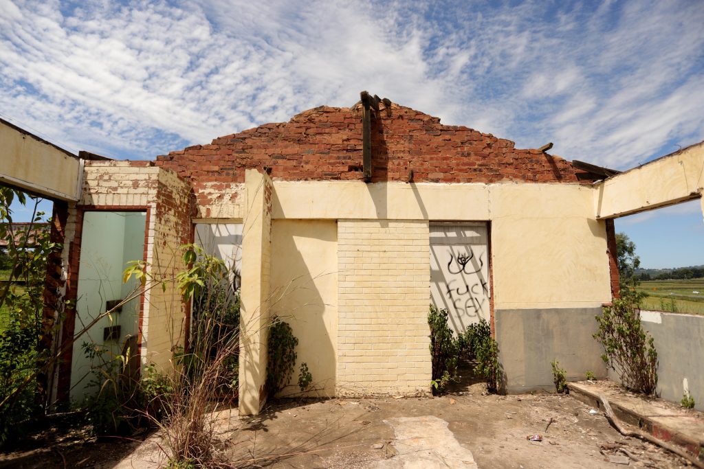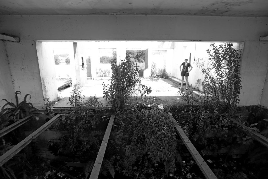 We walk through the long grass towards the station. This is the old platform, and using my experiential geography I imagine that tickets were sold just through there. I wonder how much they cost. If you walk into the station, there’s a big chunk of floor missing and you can see into the basement. It’s a swamp of ferns, chip packets, sweet wrappers, new and ancient drinking vessels, and other detritus. I notice the skeleton of a VHS tape and smile. I wonder what’s on it. Cry the Beloved Country?